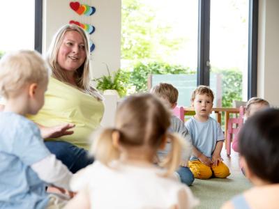 Pädagogische Fachkraft im Morgenkreis mit Kindern